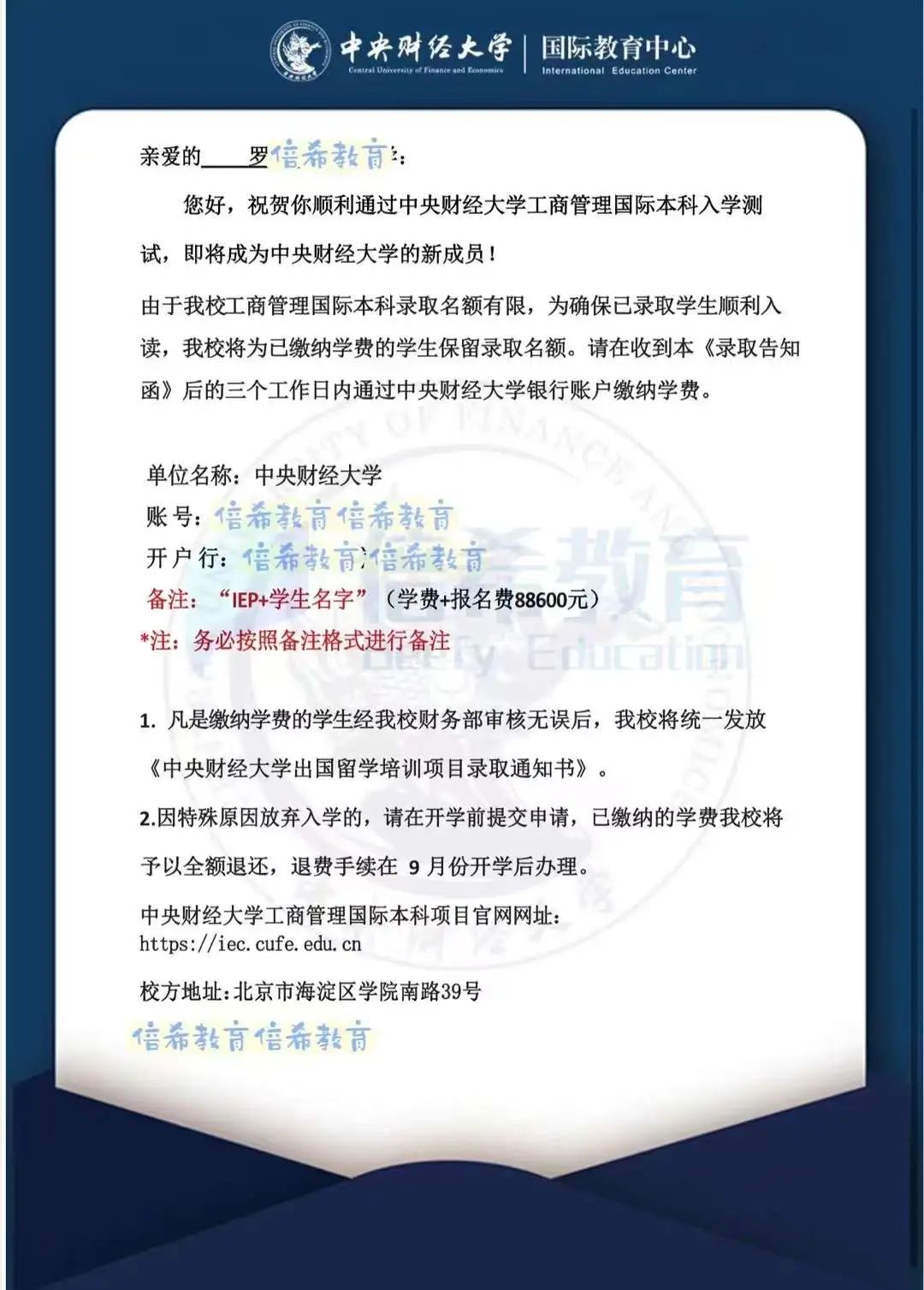 《倍希日报》176期喜报金榜题名罗同学中央财经大学6月17日,罗同学被中央财经大学澳国立专项班录取!01中央财经大学国际本科2+2专业:国际金融、市场营销、金融学、会计学等对接国家:英澳加新学费:8.8w/年招生对象:应往届高中毕业生及同等学力者要求:参加学校自主招生考试详情请戳>>>招生简章|中央财经大学国际本科2+2、3+1详情请戳>>>【澳国立专班】中央财经大学工商管理国际本科2+2项目中央财经大学02录取通知031V1规划升学方案我们秉持“适合自己的就是最好的”的规划理念,尊重每一位学生的独特性,理解不同家庭的诉求,提供科学可行留学方案规划。致力于通过系统规划帮助中国孩子打破千军万马过独木桥的魔咒,升入理想学府,打开名校之门。选择倍希,孩子未来将倍有希望!*联系方式01扫码咨询,1V1定制专属留学方案02扫码关注,超多干货尽在小红书03扫码关注,更多内容尽在抖音< OFFER · 往期回顾 >五月份国际本科offer(部分)六月份国际本科offer(部分)七月份国际本科offer(部分)马来西亚offer(部分)●倍希教育|一对一定制留学●最全资讯|你必须了解得留学知识●国际本科|你必须知道得知识●国际本科|你不得不看得招生简章●【新马泰乌】你必须知道得知识●【新马泰乌】你不得不看得招生简章●中外合作硕士—你不得不知道得知识END本公众号部分内容来自互联网,版权归原作者所有,如无意中侵犯了哪个媒体、公司、企业或个人等的知识产权,请及时通知我们,以便我方迅速删除相关图文内容,避免给双方造成不必要的损失。